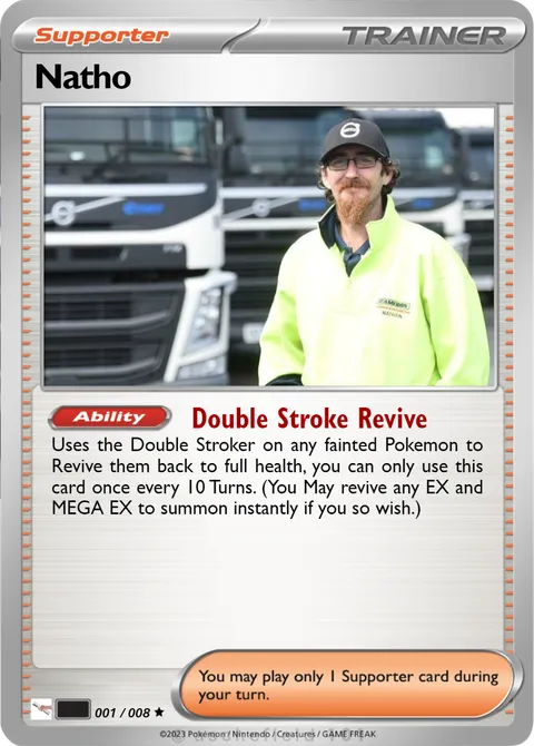 Uses the Double Stroker on any fainted Pokemon to Revive them back to full health, you can only use this card once every 10 Turns. (You May revive any EX and MEGA EX to summon instantly if you so wish.)