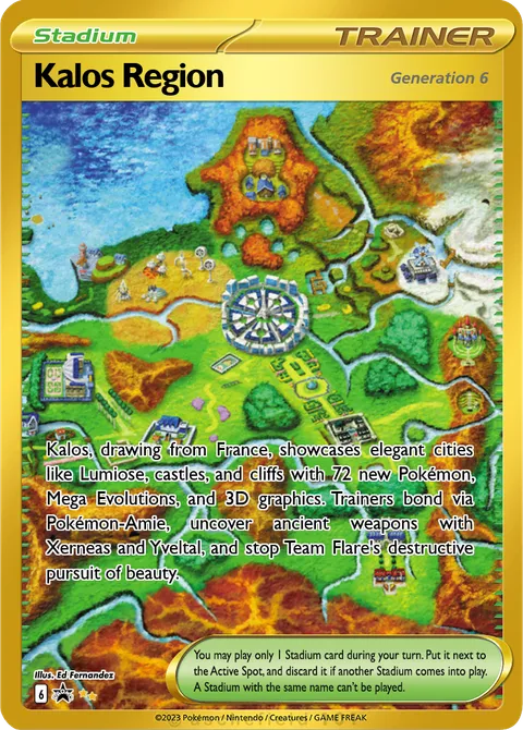 Kalos, drawing from France, showcases elegant cities like Lumiose, castles, and cliffs with 72 new Pokémon, Mega Evolutions, and 3D graphics. Trainers bond via Pokémon-Amie, uncover ancient weapons with Xerneas and Yveltal, and stop Team Flare's destructive pursuit of beauty.