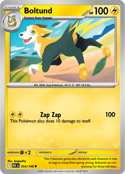 NO. 0836 Dog Pokémon HT: 3' 3" WT: 75.0 lbs.illus. Sergeykhy#054/148This Pokémon generates electricity and channels it into its legs to keep them going strong. Boltund can run nonstop for three full days.Created by @sergeykhy on 29 December 2025Includes assets by Creatures Inc.