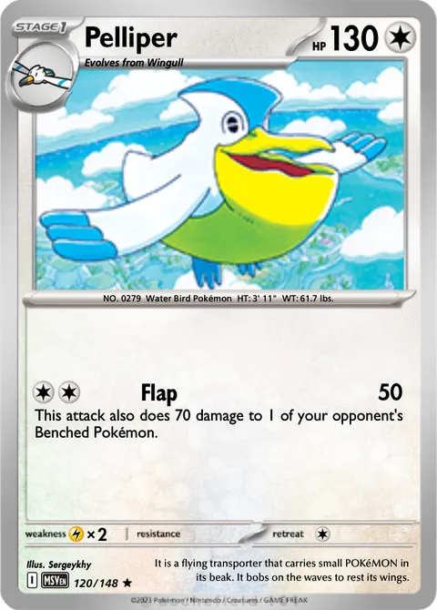 NO. 0279 Water Bird Pokémon HT: 3' 11" WT: 61.7 lbs.illus. Sergeykhy#120/148It is a flying transporter that carries small POKéMON in its beak. It bobs on the waves to rest its wings.Created by @sergeykhy on 12 January 2026Includes assets by Creatures Inc.