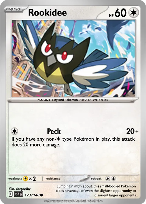 NO. 0821 Tiny Bird Pokémon HT: 0' 8" WT: 4.0 lbs.illus. Sergeykhy#123/148Jumping nimbly about, this small-bodied Pokémon takes advantage of even the slightest opportunity to disorient larger opponents.Created by @sergeykhy on 12 January 2026