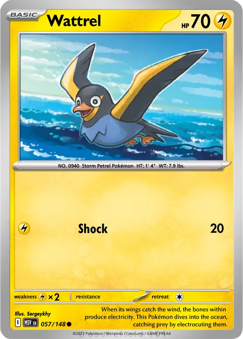 NO. 0940 Storm Petrel Pokémon HT: 1' 4" WT: 7.9 lbs.illus. Sergeykhy#057/148When its wings catch the wind, the bones within produce electricity. This Pokémon dives into the ocean, catching prey by electrocuting them.Created by @sergeykhy on 29 December 2025