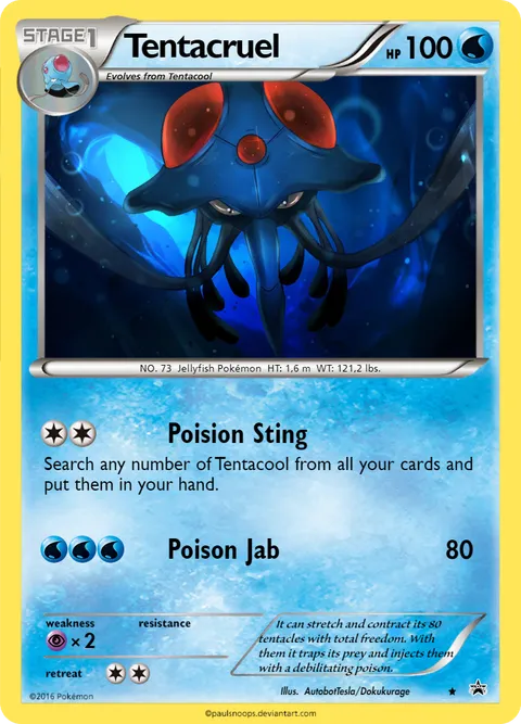 NO. 73 Jellyfish Pokémon HT: 1,6 m WT: 121,2 lbs.illus. AutobotTesla/Dokukurage It can stretch and contract its 80 tentacles with total freedom. With them it traps its prey and injects them with a debilitating poison. Created by @skull on 23 November 2023