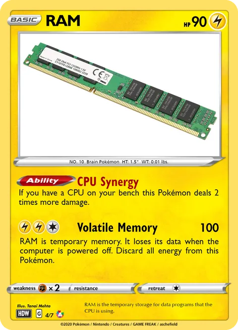 NO. 10 Brain Pokémon HT: 1.5" WT: 0.01 lbs.illus. Tanai Mehta#4/7RAM is the temporary storage for data programs that the CPU is using. Created by @tanaimehta on 05 January 2024