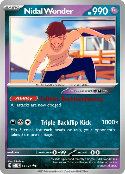 NO. 43 Backflip Pokémon HT: 5"6' WT: 70 lbs.illus. PokeTariq#43/72Freestyle flipper and recently a singer, Nidal Wonder is a famous YouTuber and has set the world record as the youngest flipper.Created by @tariq_123 on 20 August 2025Includes assets by Creatures Inc.