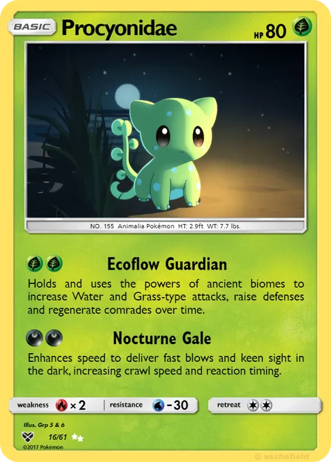 Holds and uses the powers of ancient biomes to increase Water and Grass-type attacks, raise defenses and regenerate comrades over time. Enhances speed to deliver fast blows and keen sight in the dark, increasing crawl speed and reaction timing. NO. 155 Animalia Pokémon HT: 2.9ft WT: 7.7 lbs.illus. Grp 5 & 6#16/61