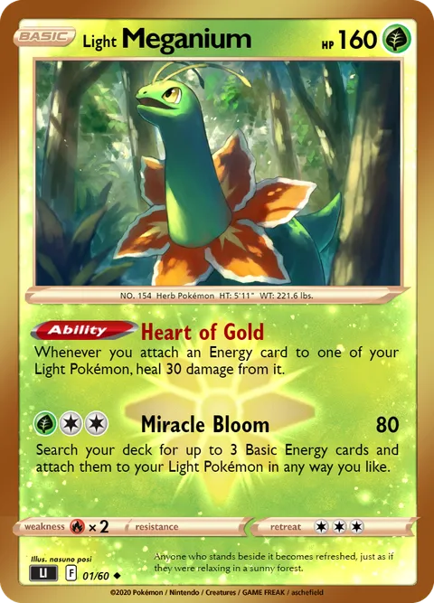 Whenever you attach an Energy card to one of your Light Pokémon, heal 30 damage from it.Miracle Bloom • 80
