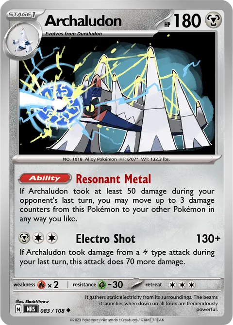 If Archaludon took at least 50 damage during your opponent's last turn, you may move up to 3 damage counters from this Pokémon to your other Pokémon in any way you like.Electro Shot • 130+