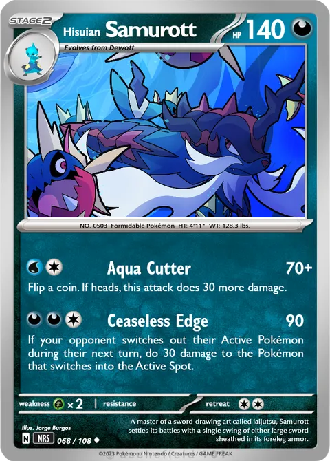NO. 0503 Formidable Pokémon HT: 4'11" WT: 128.3 lbs.illus. Jorge Burgos#068/108A master of a sword-drawing art called iaijutsu, Samurott settles its battles with a single swing of either large sword sheathed in its foreleg armor.Created by @tcgpoke16 on 21 April 2025