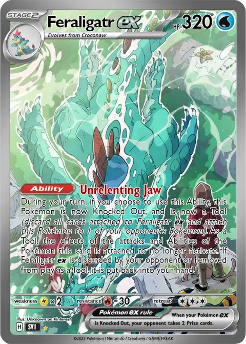 During your turn, if you choose to use this Ability, this Pokémon is now Knocked Out, and is now a Tool (discard all cards attached to Feraligatr e and attach this Pokémon to 1 of your opponent's Pokémon). As a Tool, the effects of the attacks and Abilities of the Pokémon this card is attached to no longer activate. If Feraligatr e is discarded by your opponent or removed from play as a Tool, it is put back into your hand.