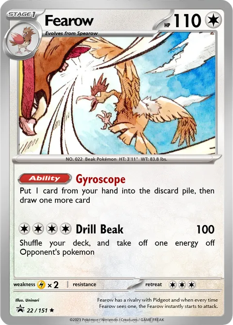 NO. 022 Beak Pokémon HT: 3'11" WT: 83.8 lbs.illus. Uninori#22/151Fearow has a rivalry with Pidgeot and when every time Fearow sees one, the Fearow instantly starts to attack.Created by @thegreatcheeseboy on 25 August 2025Includes assets by Creatures Inc.