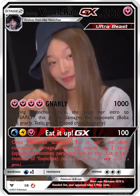 During Yoonchae’s turn, she sings her intro to “GNARLY”, this greatly damages the opponent (Boba tea; gnarly. Tesla; gnarly. Friend chicken; gnarly)