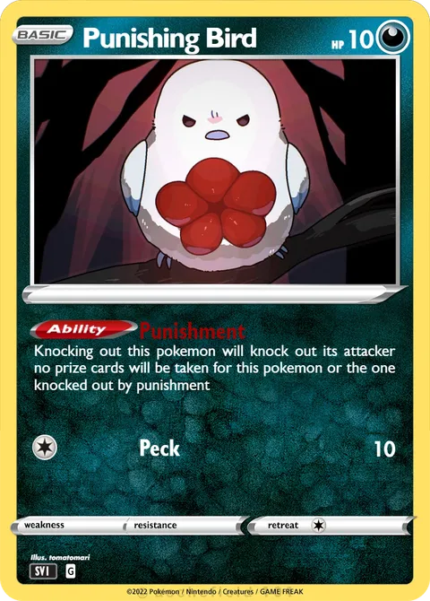 Knocking out this pokemon will knock out its attacker no prize cards will be taken for this pokemon or the one knocked out by punishmentPeck • 10