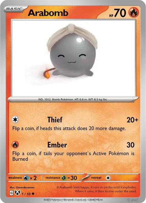 NO. 1012 Bomb Pokémon HT: 0.6 m WT: 8.5 kg lbs.illus. Cloverdexamon#1/10If Arabomb feels happy, it runs in circles until it explodes. When it rains, it likes to stay under the sand.Created by @unknowag on 18 November 2023Includes assets by Creatures Inc.