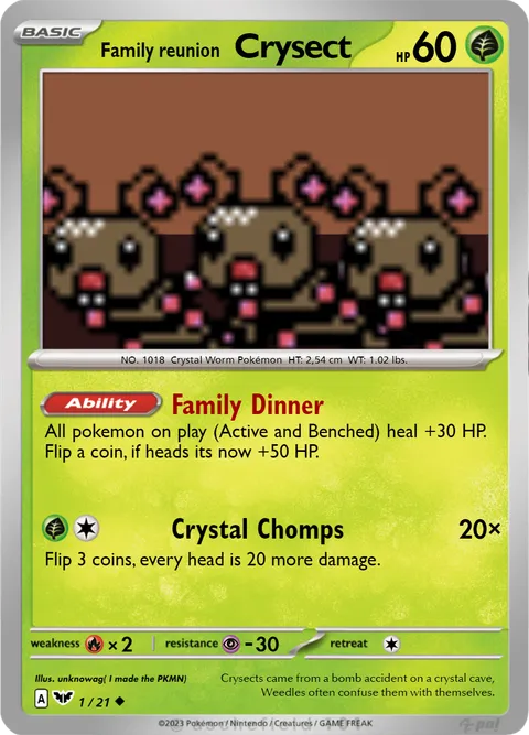 All pokemon on play (Active and Benched) heal +30 HP. Flip a coin, if heads its now +50 HP.Crystal Chomps • 20×