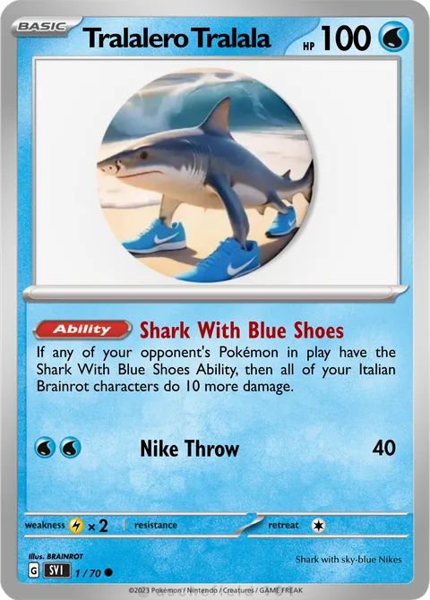 If any of your opponent's Pokémon in play have the Shark With Blue Shoes Ability, then all of your Italian Brainrot characters do 10 more damage.