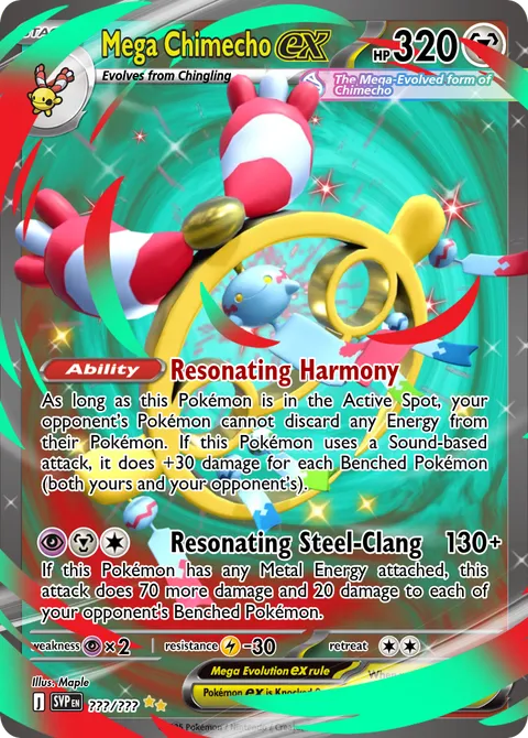 As long as this Pokémon is in the Active Spot, your opponent’s Pokémon cannot discard any Energy from their Pokémon. If this Pokémon uses a Sound-based attack, it does +30 damage for each Benched Pokémon (both yours and your opponent’s).