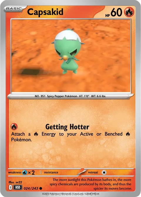 NO. 951 Spicy Pepper Pokémon HT: 1'0" WT: 6.6 lbs.illus. sv22#024/243The more sunlight this Pokémon bathes in, the more spicy chemicals are produced by its body, and thus the spicier its moves become.Created by @vincentross744 on 06 December 2025