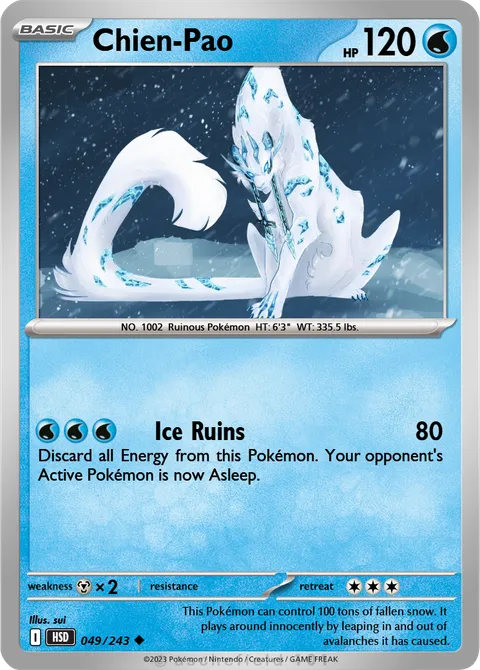 NO. 1002 Ruinous Pokémon HT: 6'3" WT: 335.5 lbs.illus. sui#049/243This Pokémon can control 100 tons of fallen snow. It plays around innocently by leaping in and out of avalanches it has caused.Created by @vincentross744 on 08 December 2025
