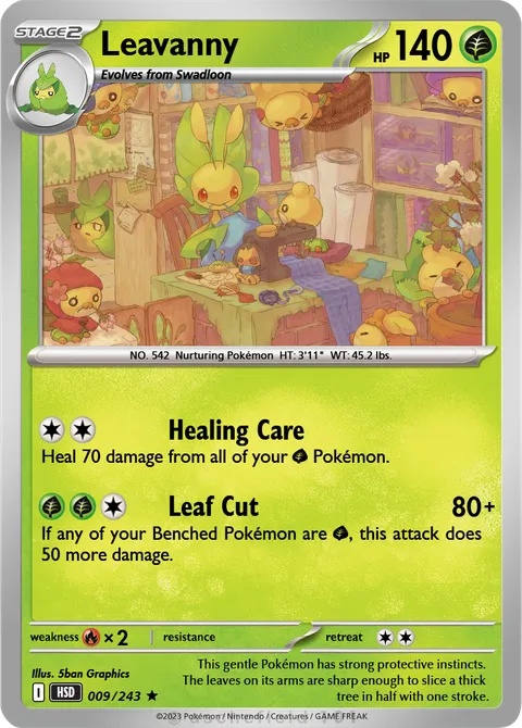 NO. 542 Nurturing Pokémon HT: 3'11" WT: 45.2 lbs.illus. 5ban Graphics#009/243This gentle Pokémon has strong protective instincts. The leaves on its arms are sharp enough to slice a thick tree in half with one stroke.Created by @vincentross744 on 03 December 2025