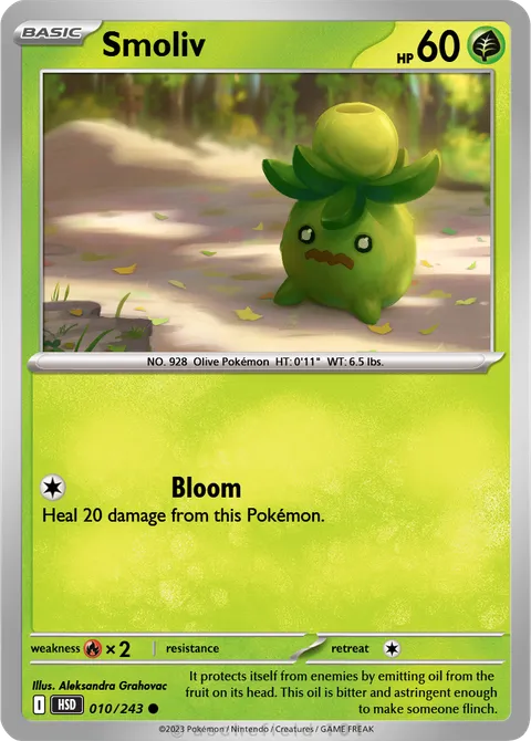 NO. 928 Olive Pokémon HT: 0'11" WT: 6.5 lbs.illus. Aleksandra Grahovac#010/243It protects itself from enemies by emitting oil from the fruit on its head. This oil is bitter and astringent enough to make someone flinch.Created by @vincentross744 on 04 December 2025