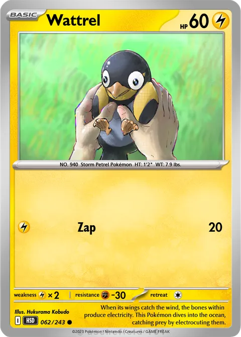 NO. 940 Storm Petrel Pokémon HT: 1'2" WT: 7.9 lbs.illus. Hukurama Kobudo#062/243When its wings catch the wind, the bones within produce electricity. This Pokémon dives into the ocean, catching prey by electrocuting them.Created by @vincentross744 on 10 December 2025