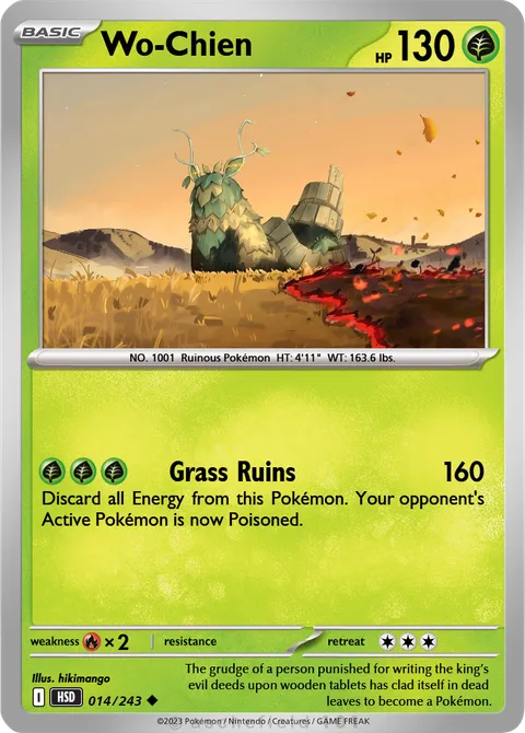 NO. 1001 Ruinous Pokémon HT: 4'11" WT: 163.6 lbs.illus. hikimango#014/243The grudge of a person punished for writing the king’s evil deeds upon wooden tablets has clad itself in dead leaves to become a Pokémon.Created by @vincentross744 on 06 December 2025
