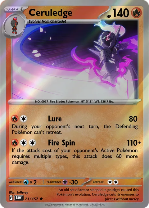 NO. 0937 Fire Blades Pokémon HT: 5' 3" WT: 136.7 lbs.illus. Sufferay#21/157An old set of armor steeped in grudges caused this Pokémon’s evolution. Ceruledge cuts its enemies to pieces without mercy.Created by @xXsavatron on 09 January 2026Includes assets by Creatures Inc.