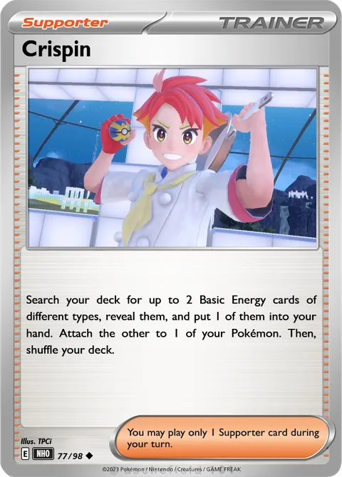 Search your deck for up to 2 Basic Energy cards of different types, reveal them, and put 1 of them into your hand. Attach the other to 1 of your Pokémon. Then, shuffle your deck.