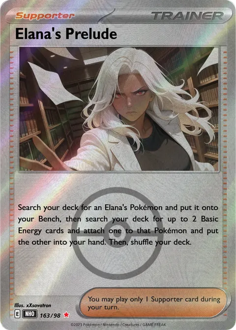 Search your deck for an Elana's Pokémon and put it onto your Bench, then search your deck for up to 2 Basic Energy cards and attach one to that Pokémon and put the other into your hand. Then, shuffle your deck.