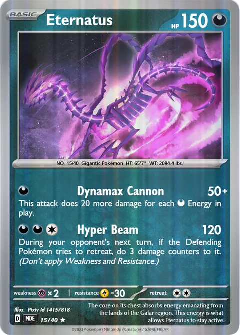 NO. 15/40 Gigantic Pokémon HT: 65'7" WT: 2094.4 lbs.illus. Pixiv Id 14157818#15/40The core on its chest absorbs energy emanating from the lands of the Galar region. This energy is what allows Eternatus to stay active.Created by @xXsavatron on 29 November 2025
