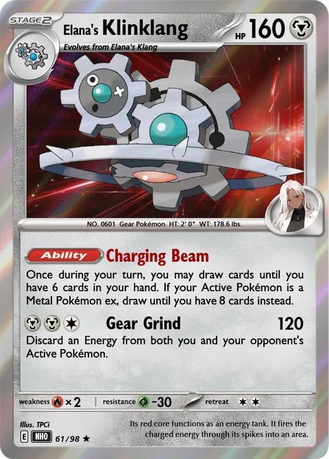Once during your turn, you may draw cards until you have 6 cards in your hand. If your Active Pokémon is a Metal Pokémon ex, draw until you have 8 cards instead.Gear Grind • 120