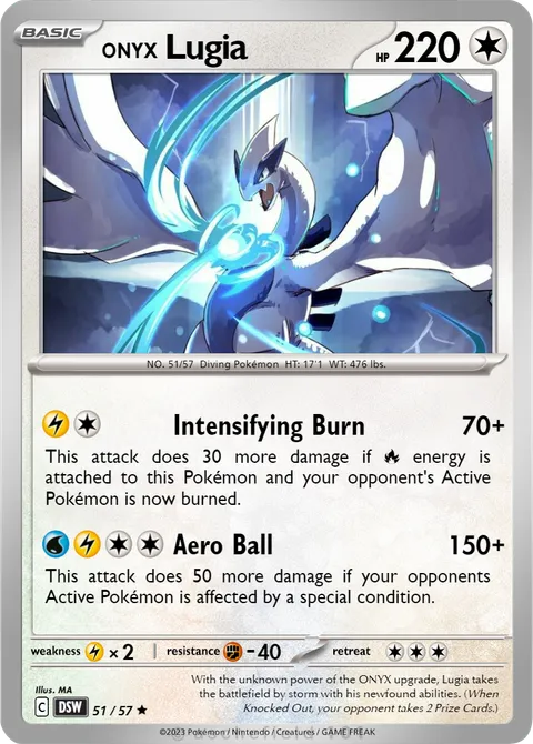 NO. 51/57 Diving Pokémon HT: 17'1 WT: 476 lbs.illus. MA#51/57With the unknown power of the ONYX upgrade, Lugia takes the battlefield by storm with his newfound abilities. (When Knocked Out, your opponent takes 2 Prize Cards.)Created by @xXsavatron on 15 January 2025
