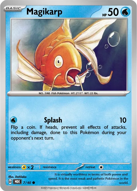 NO. 7/40 Fish Pokémon HT: 2'11" WT: 22 lbs.illus. Dahlieka#7/40It is virtually worthless in terms of both power and speed. It is the most weak and pathetic Pokémon in the world.Created by @xXsavatron on 27 November 2025