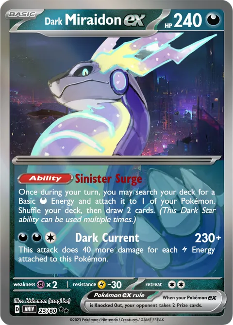 Once during your turn, you may search your deck for a Basic D Energy and attach it to 1 of your Pokémon. Shuffle your deck, then draw 2 cards. (This Dark Star ability can be used multiple times.)Dark Current • 230+