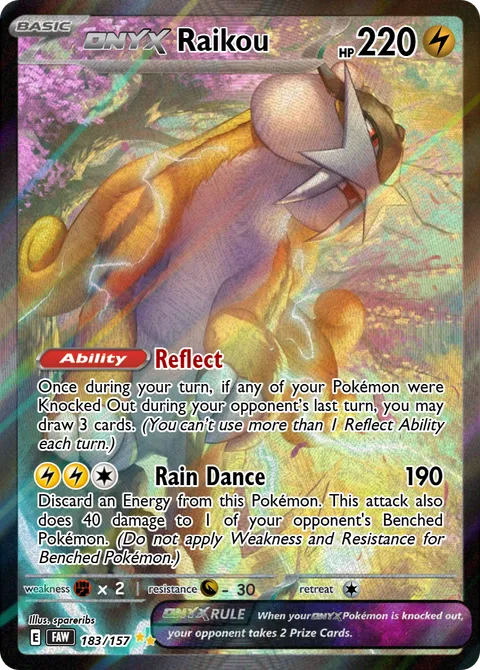 Once during your turn, if any of your Pokémon were Knocked Out during your opponent’s last turn, you may draw 3 cards. (You can’t use more than 1 Reflect Ability each turn.)Rain Dance • 190