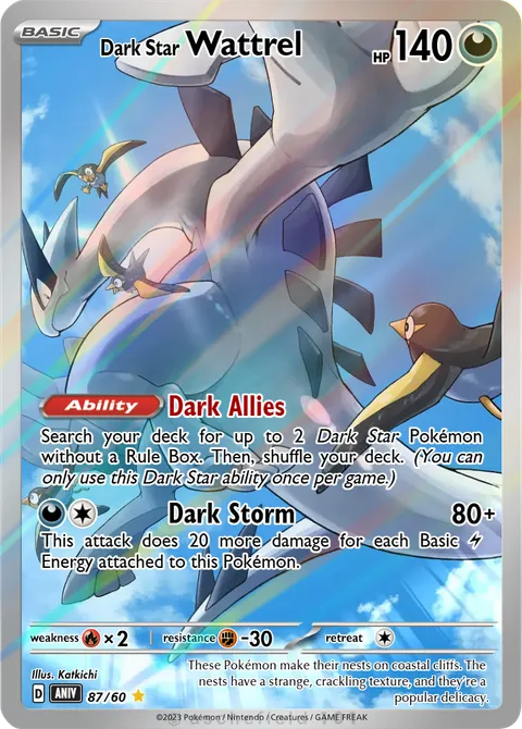 Search your deck for up to 2 Dark Star Pokémon without a Rule Box. Then, shuffle your deck. (You can only use this Dark Star ability once per game.)Dark Storm • 80+