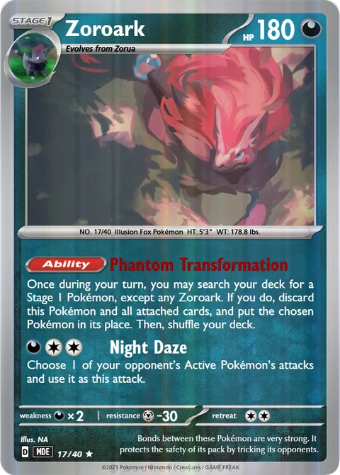 Once during your turn, you may search your deck for a Stage 1 Pokémon, except any Zoroark. If you do, discard this Pokémon and all attached cards, and put the chosen Pokémon in its place. Then, shuffle your deck.Night Daze