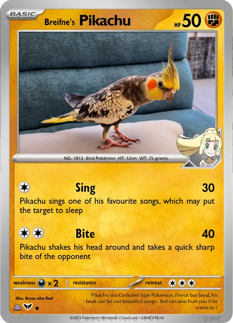 NO. 1813 Bird Pokémon HT: 12cm WT: 75 grams.illus. Bryce aka DadPikachu is a Cockatiel type Pokemon. Fierce but loyal, his beak can let out beautiful songs.. But can also hurt you if he wants to !