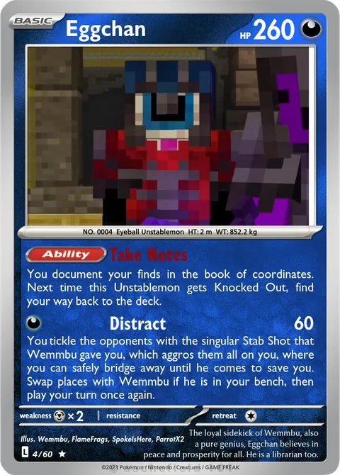 NO. 0004 Eyeball Unstablemon HT: 2 m WT: 852.2 kgillus. Wemmbu, FlameFrags, SpokeIsHere, ParrotX2#4/60 The loyal sidekick of Wemmbu, also