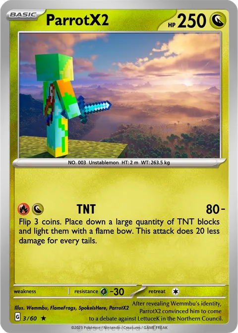 NO. 003 Unstablemon HT: 2 m WT: 263.5 kgillus. Wemmbu, FlameFrags, SpokeIsHere, ParrotX2#3/60 After revealing Wemmbu's identity,