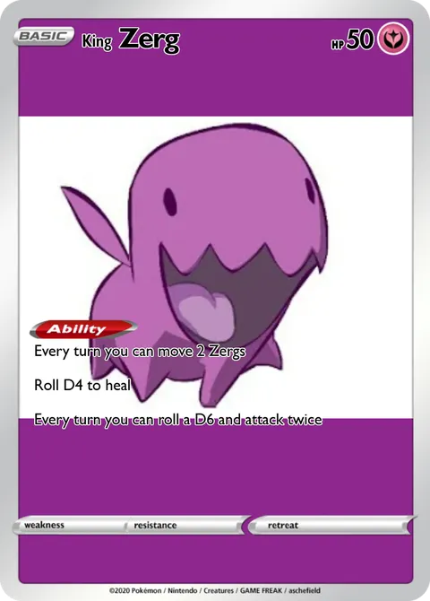 Every turn you can move 2 Zergs Roll D4 to heal Every turn you can roll a D6 and attack twice